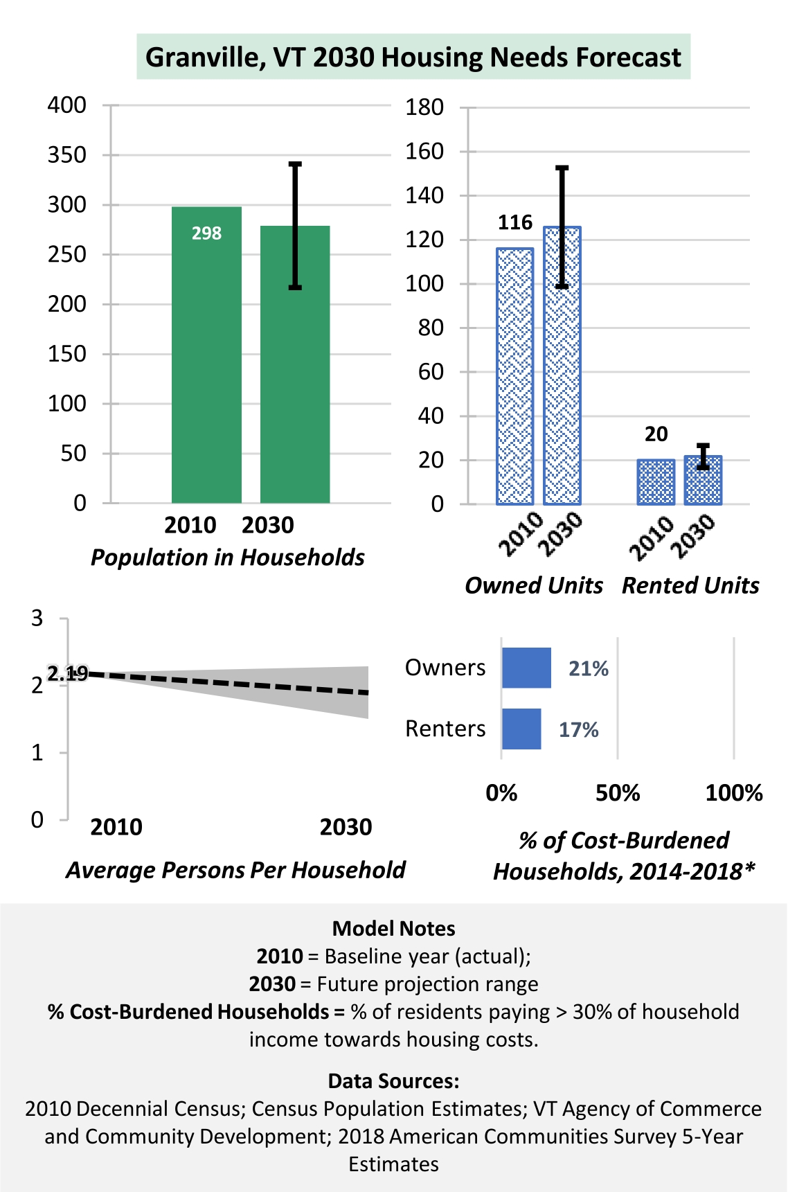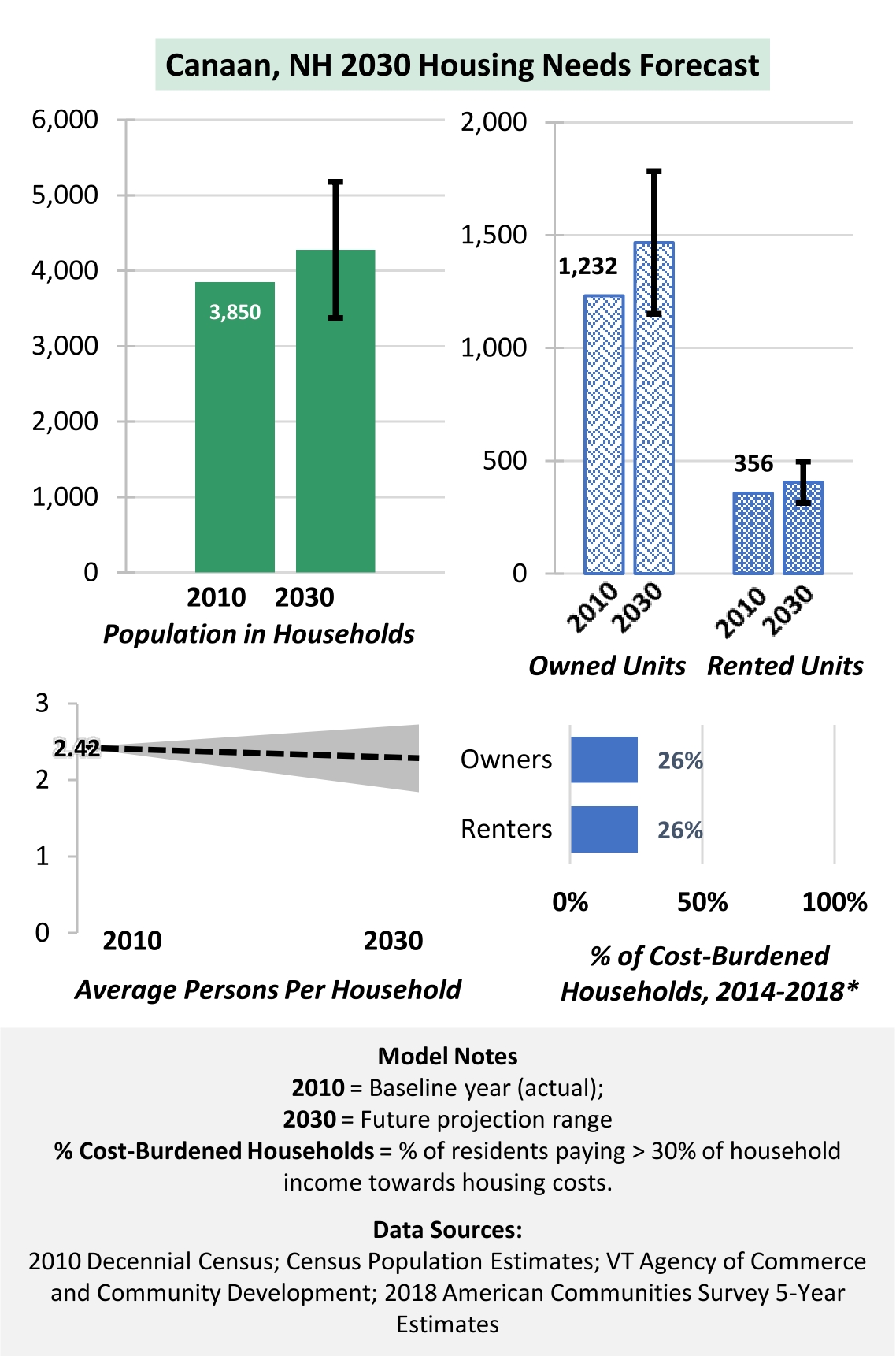 With any modeling effort, it is important to keep in mind both the goals and limitations. A common saying in the field of statistics is that “all models are wrong, but some are useful.” This forecast does not attempt to produce specific estimates of population and housing units – the goal is to apply and extrapolate general demographic trends to anticipate future housing needs. Many factors can influence population sizes and housing options, particularly over a ten-year period. For example, the COVID-19 pandemic led to an influx of residents to Vermont and New Hampshire as well as economic challenges for current residents – such an event cannot be predicted using a simple model.